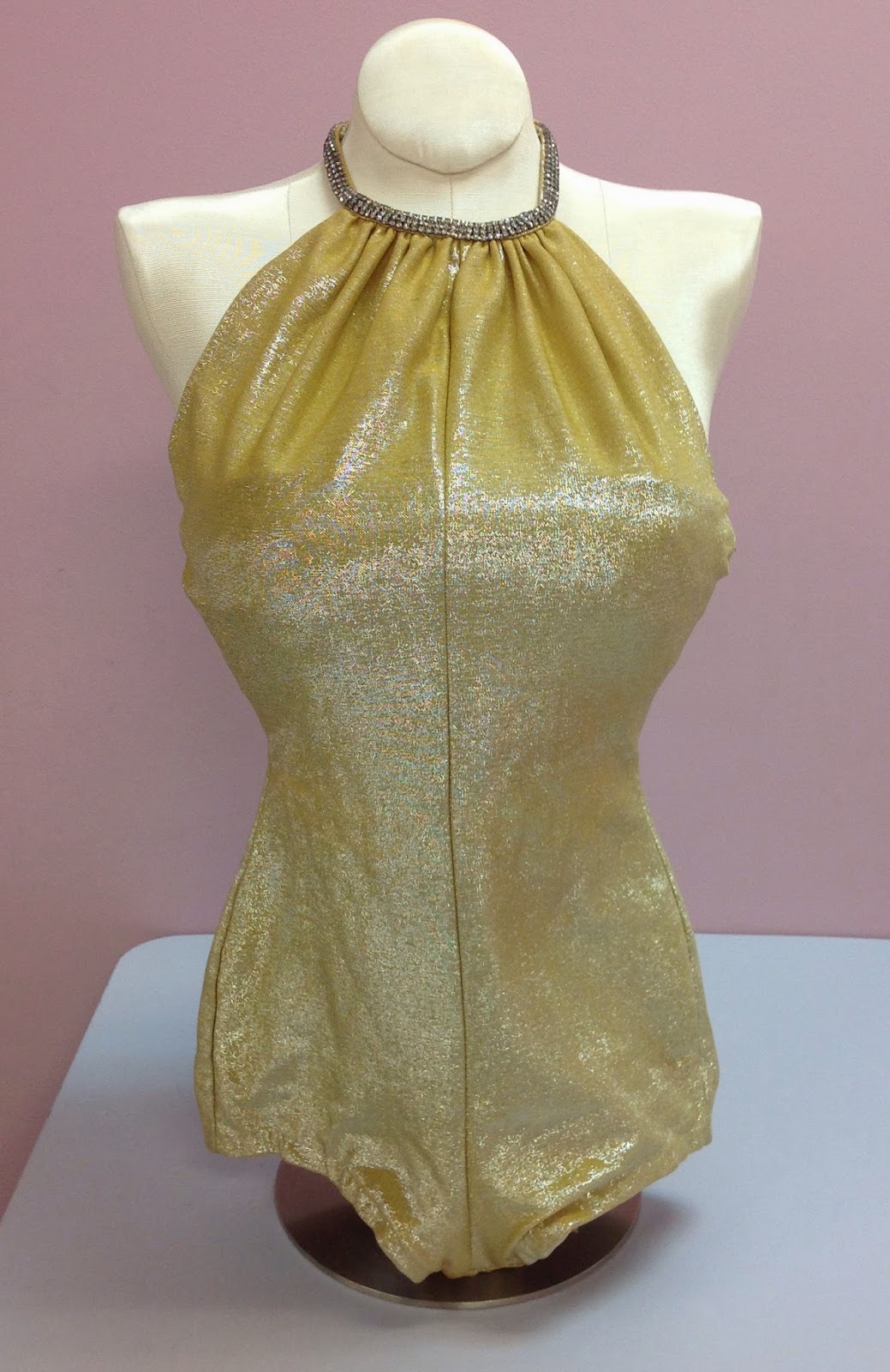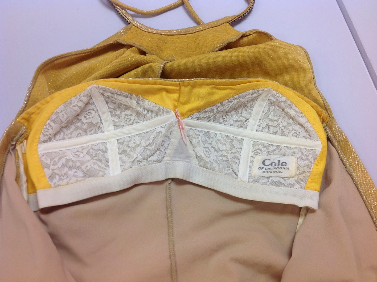 Today we had a real treat in the Swim Masters Class. One of my students brought in a vintage gold swimsuit for us to see and examine. Little did she know, that peering into vintage apparel is a passion of mine! Here is the suit, and it is lovely!