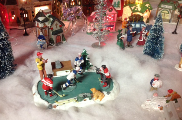 Look at these tiny kids playing hockey on the village ice rink! (Well, this IS Canada!) Oh wait, there’s more kids playing in the snow as well! There’s also a group singing carols. You can just see the tiny streetlights in the background, too!