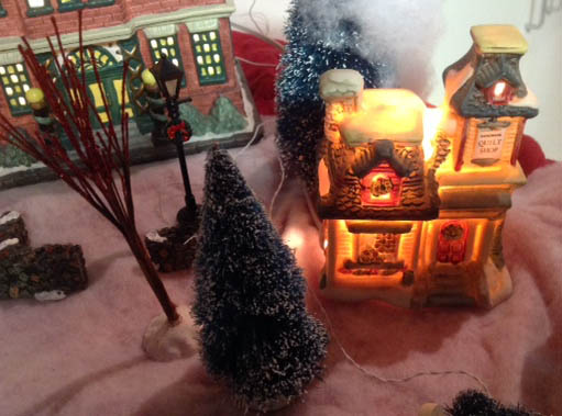 We have a weird little corner in our store – it’s under the stairs leading to the apartments upstairs. That corner is usually the catch-all corner for remnants, left-overs and sale items. Not an attractive corner by any means. Some time ago, one of our students offered us a deal to take all the remnants off our hands – it would be useful to her to make up samples and experiment with designs. But for us, it would be great to clear that space! But what should we put in it? Before I could make any decisions about a display, a magical thing happened overnight and we came in to Christmas in the Village! A tiny village appeared in that space under the stairs, complete with houses, buildings, trees and people!