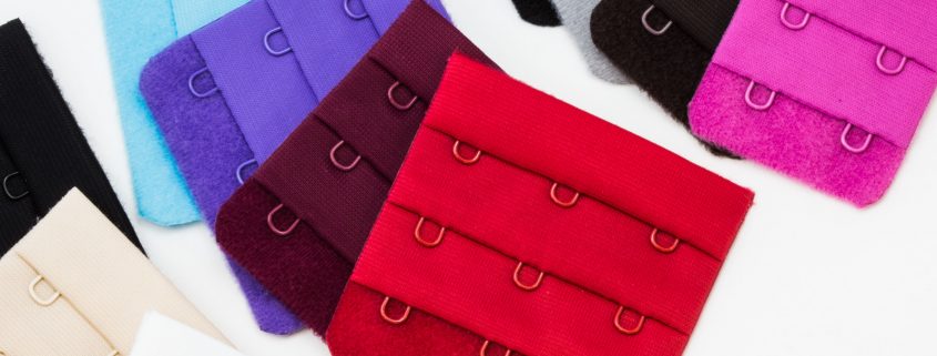 First, start by knowing what you could be working with. Hooks and eyes are available in several variations, and I am not just talking about colour. Hooks and eyes are sold by the number of rows and columns, such as 2 hooks high and 3 columns wide. Here at Bra-makers, we have 2 x 3, 3 x 3, 4 x 3 and even 5 x 3 configurations. This refers to the number of hooks high by the number of columns wide.