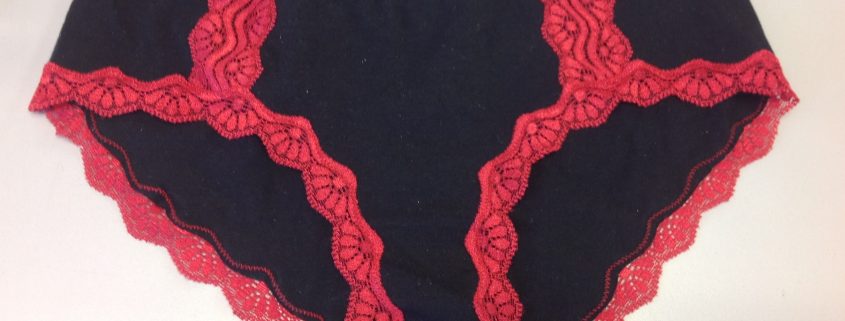 Ready to wear does some impressive sewing, like the enclosed perfect panty gussets (we never call it a “crotch”) on a pair of panties. Even inexpensive panties will have both ends of the gusset enclosed like this…